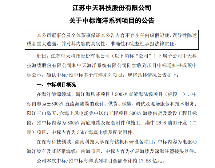 10月16日,中天科技(600522.SH)公告称,下属子公司中天科技海缆股份有限公司和中天海洋系统有限公司陆续收到项目中标通知书或预中标公示,确认中标/预中标多个海洋系列项目。公司本次中标/预中标海洋系列项目金额合计约17.88亿元,占公司 2024 年度经审计营业收入的 3.72%,对公司后续年度经营业绩将有积极影响。